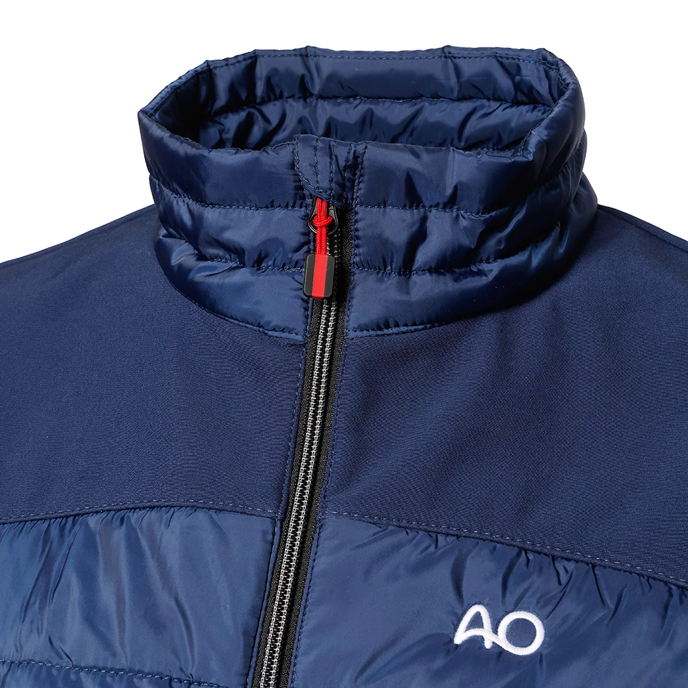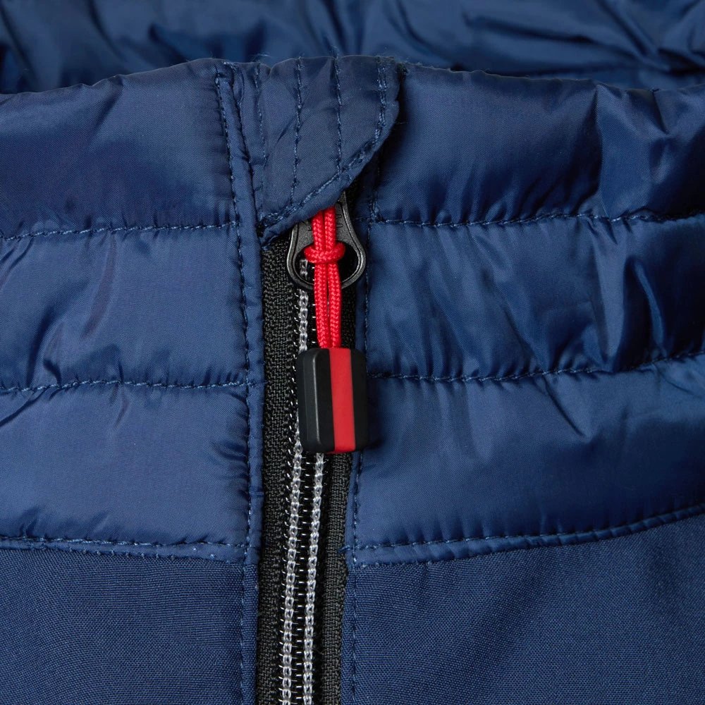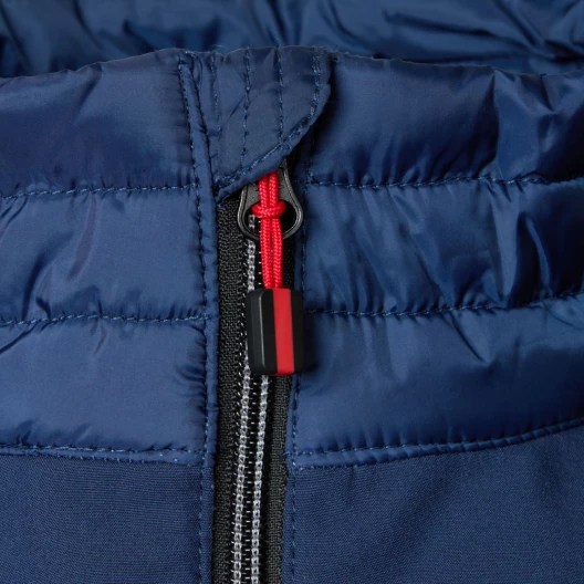 Padded gilet quilted and with softshell inserts over the shoulder and sides. Two outside pockets with zipper, inside two pouch pockets mesh lined. Elastic band as a finish at the hem.